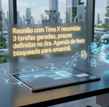 Acabaram-se as atas de reunião manuais. Ferramentas como Otter.ai e Microsoft Teams AI transcrevem a reunião, destacam as decisões tomadas e enviam automaticamente as tarefas para o gerenciador de projetos da equipe, marcando os responsáveis e prazos.