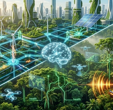 A IA agora gerencia cidades inteligentes (Smart Cities), prevendo picos de demanda e redirecionando energia renovável (solar e eólica) de forma eficiente. Isso reduz o desperdício e a dependência de fontes fósseis.